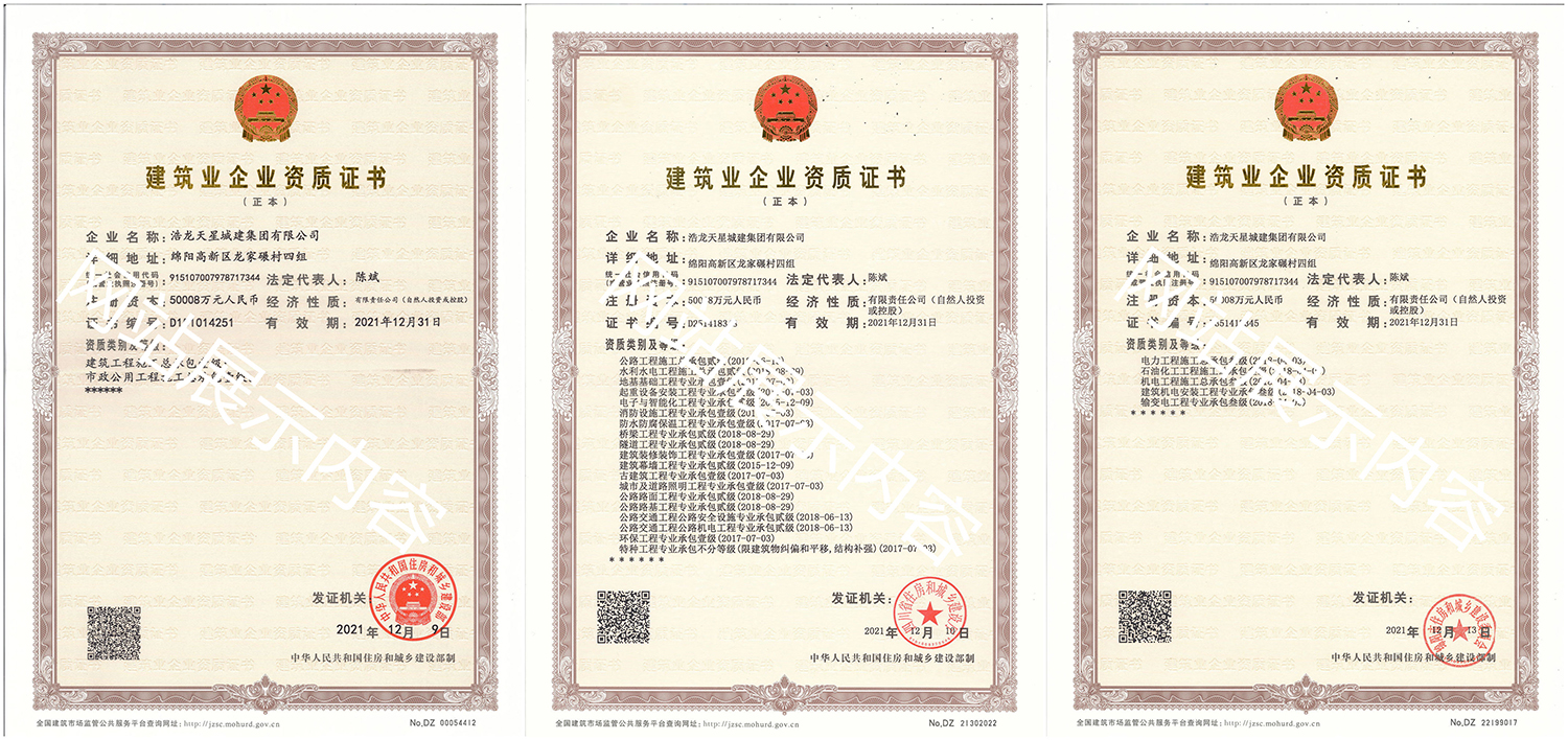 浩龍天星城建集團有限公司,2007年成立于“李白故鄉、中國科技城”—四川省綿陽市,企業注冊資本金5.0008億元。公司共有27項建筑業企業資質,其中國家一級資質11項,二級資質10項,三級資質5項,特種資質不分等級1項,類別涵蓋建筑、市政、水利、機電、隧道、起重設備安裝等基礎及未來發展重點專業。公司下設三個辦事處,業務范圍輻射全國,在建項目三十余個,累計完成產值超11億元。公司是綿陽市建筑施工企業協會副會長單位、綿陽遂寧商會會長級單位、綿陽首批建筑業綠卡企業,在綿陽本地企業中綜合實力名列前茅。
